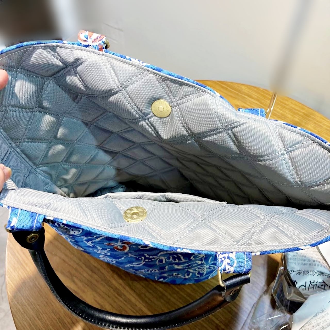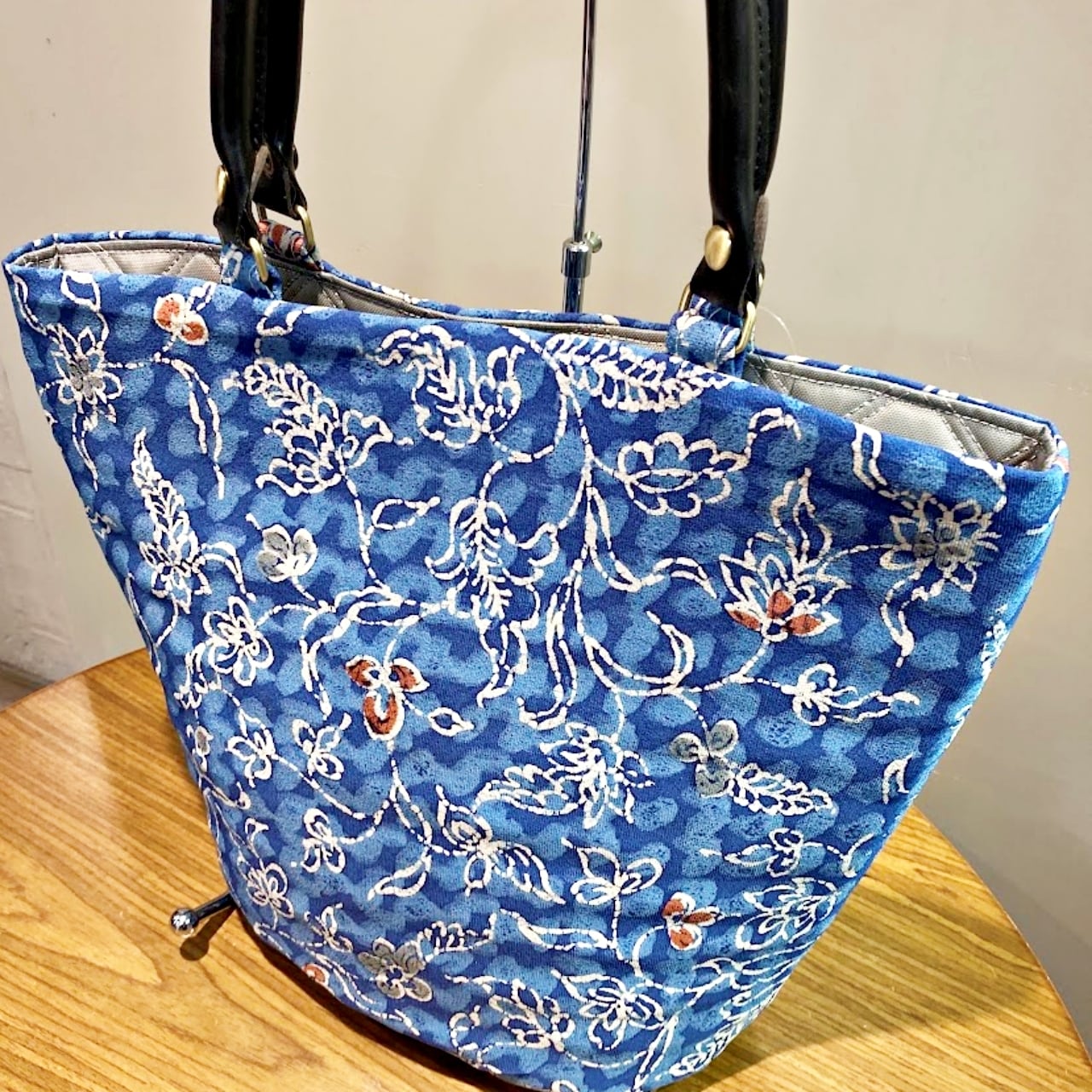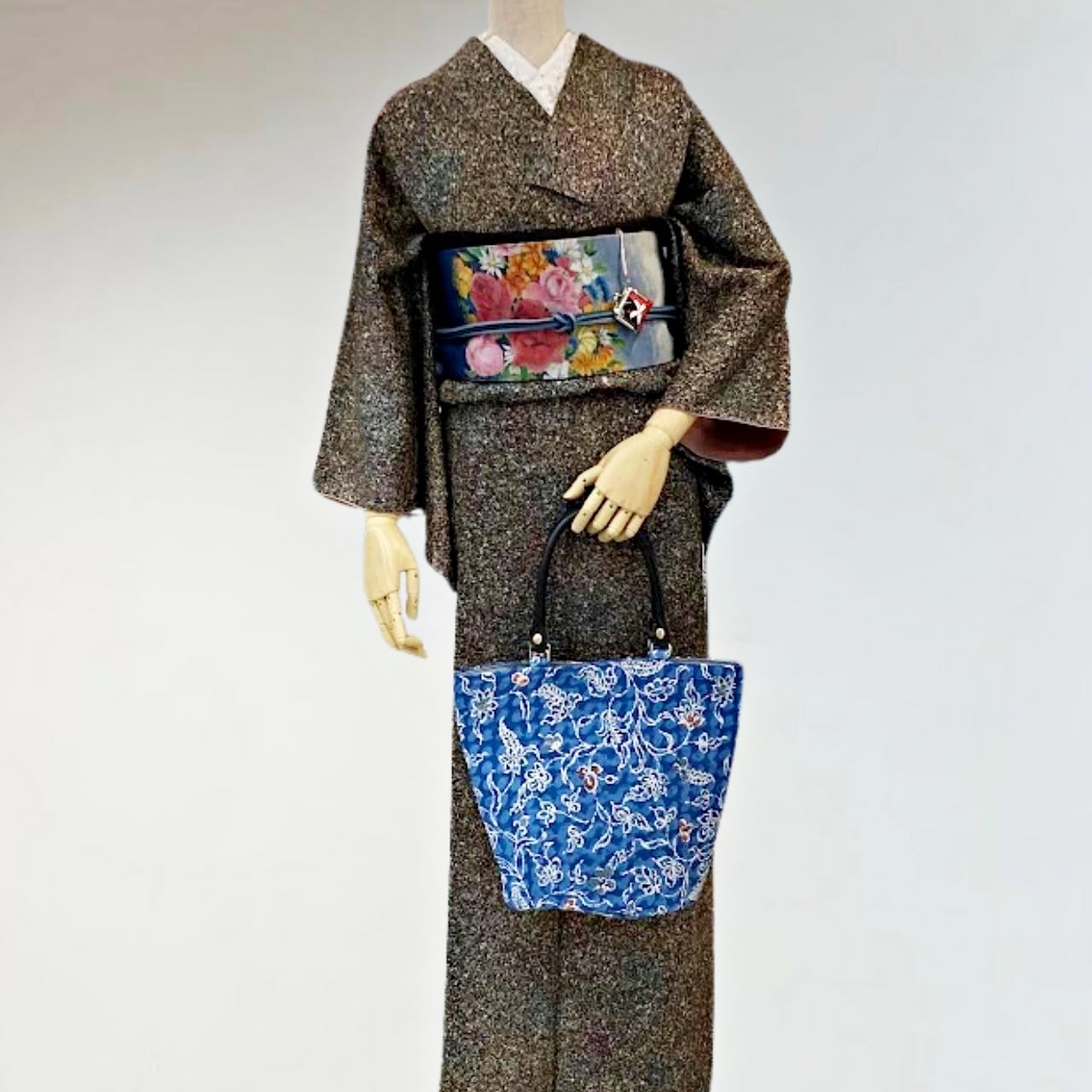 ※このバッグには、青地にろうけつ染めが施された着物地を使用しています。