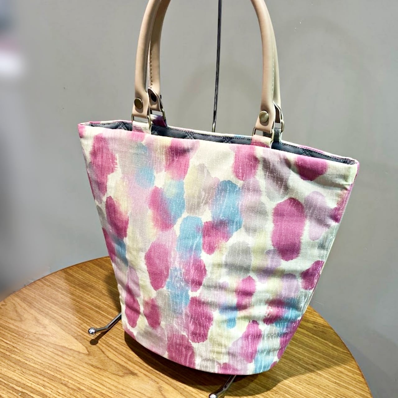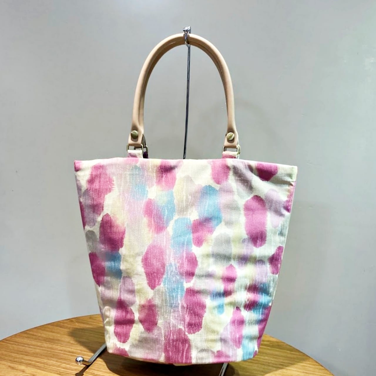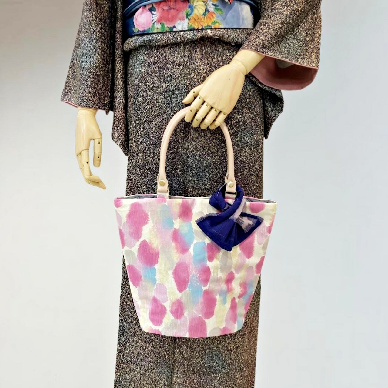 このバッグには、淡いピンク・ブルー・紫・黄色が重なり合う羽織地を使用しています。