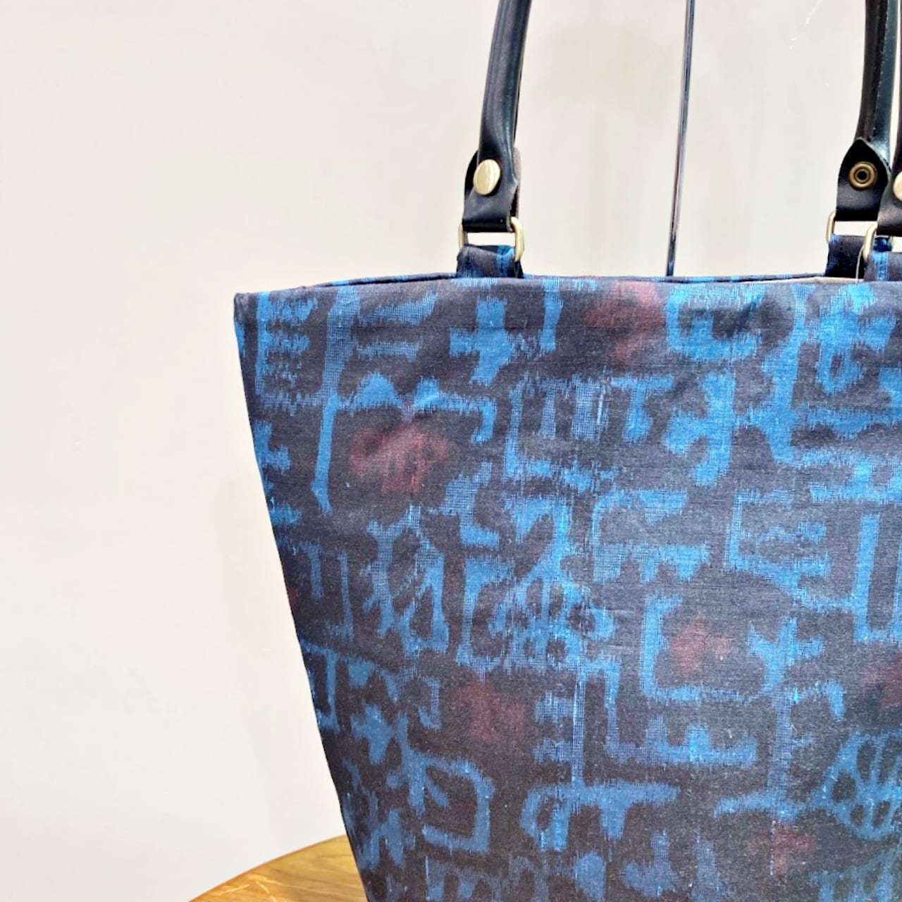 このバッグには、青地に抽象的な模様が浮かぶ大島紬を使用しています。 見る角度によって印象が変わる、余白のある美しさをまとった一点です。