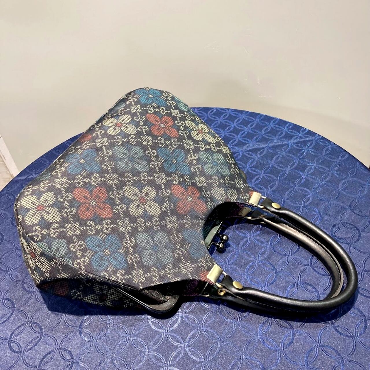 黒小花柄 大島紬|あおりがまぐちバッグ・大|大容量・ポケット付き|着物リメイク