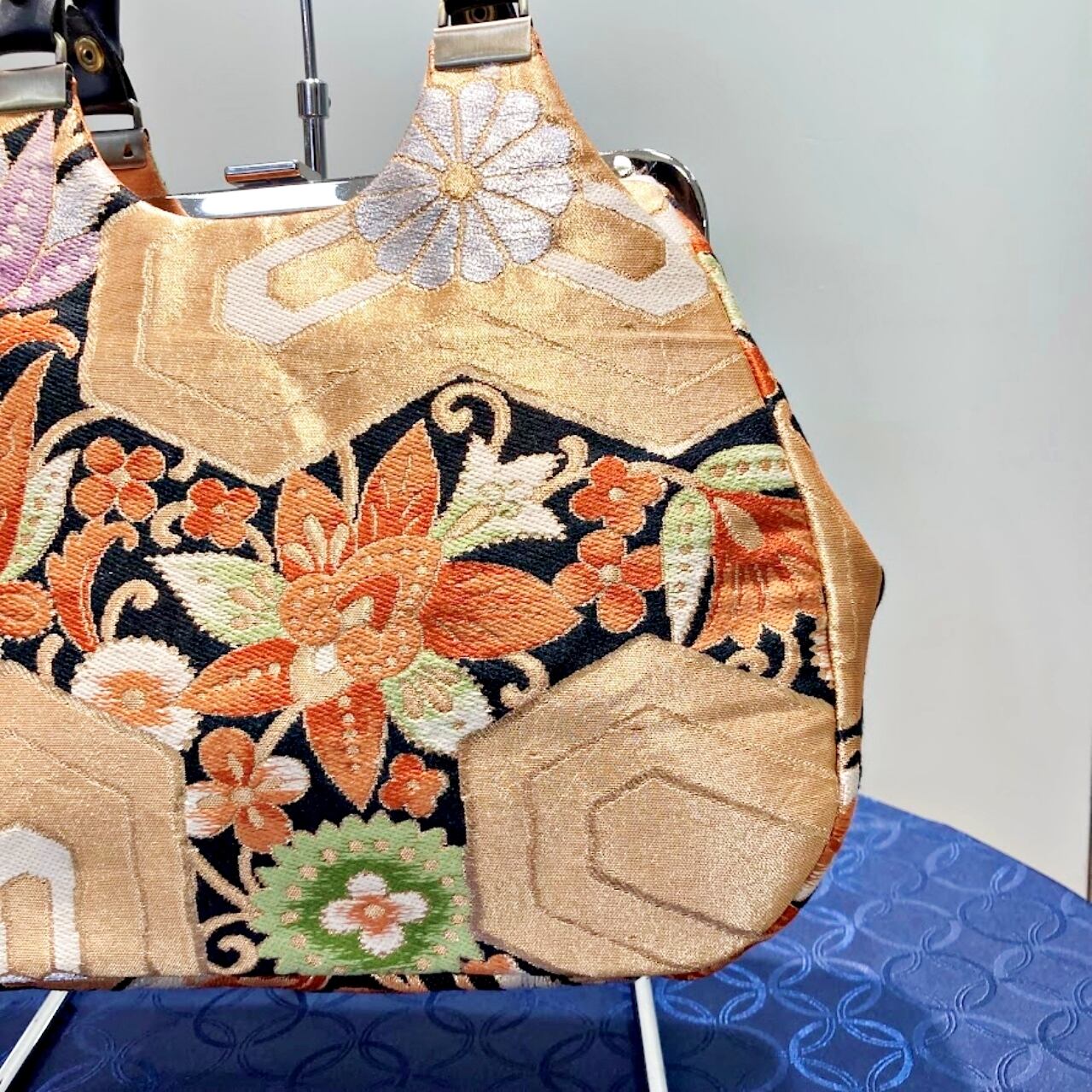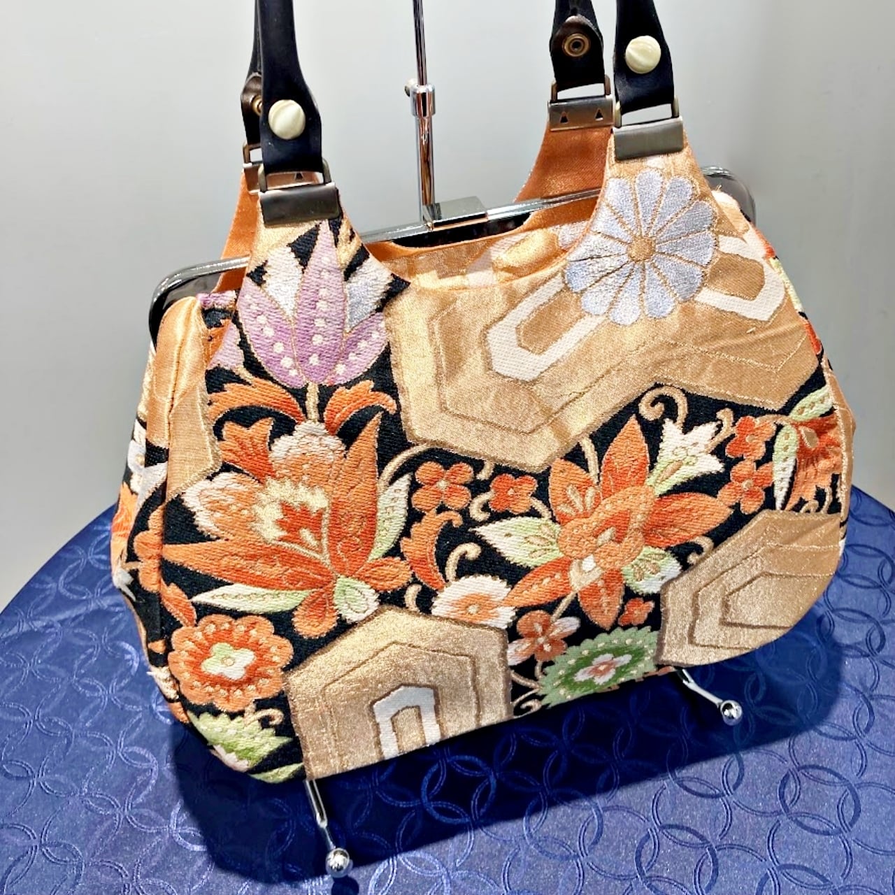 黒地袋帯×金彩花文|あおりがまぐちバッグ|大容量・ポケット付き|着物リメイク
