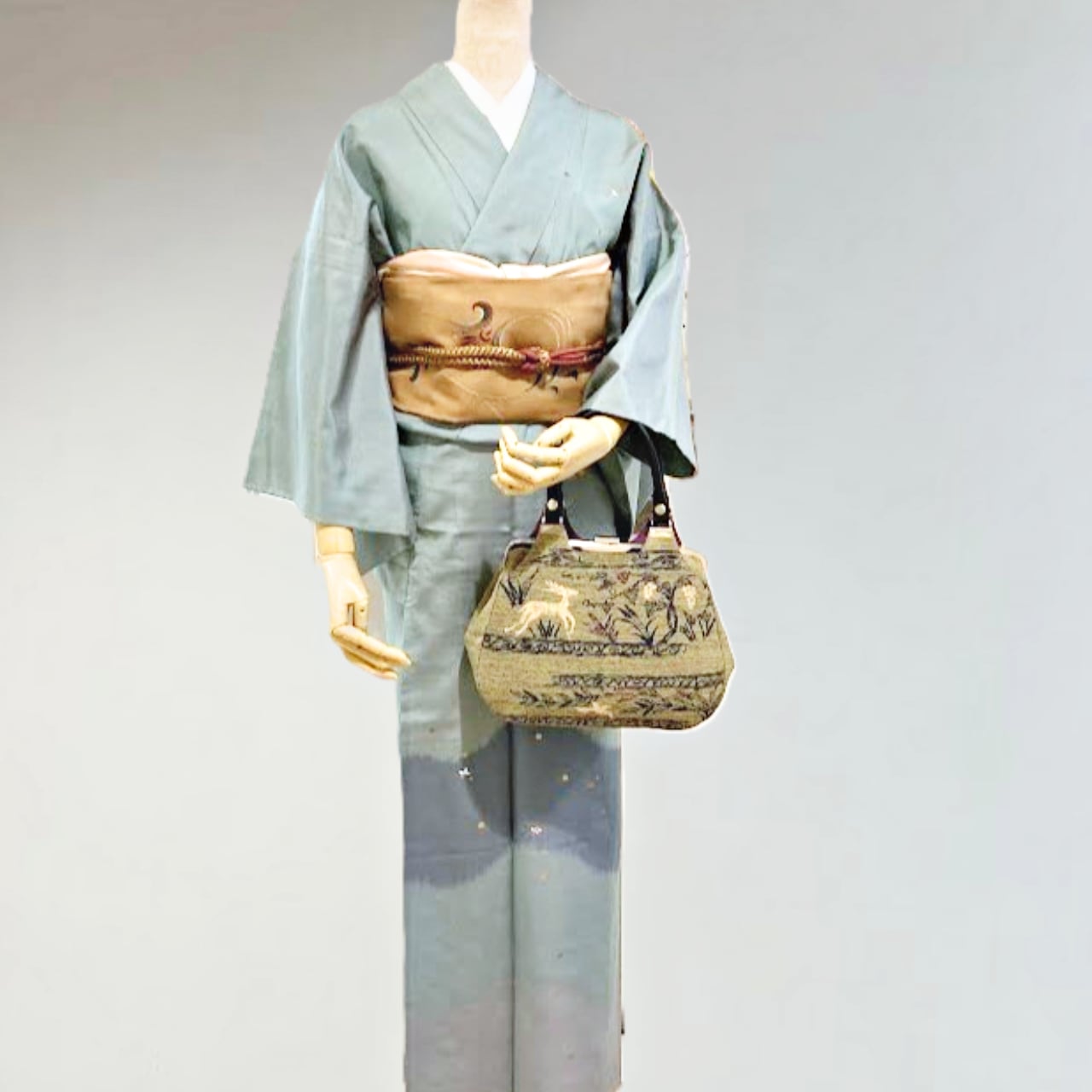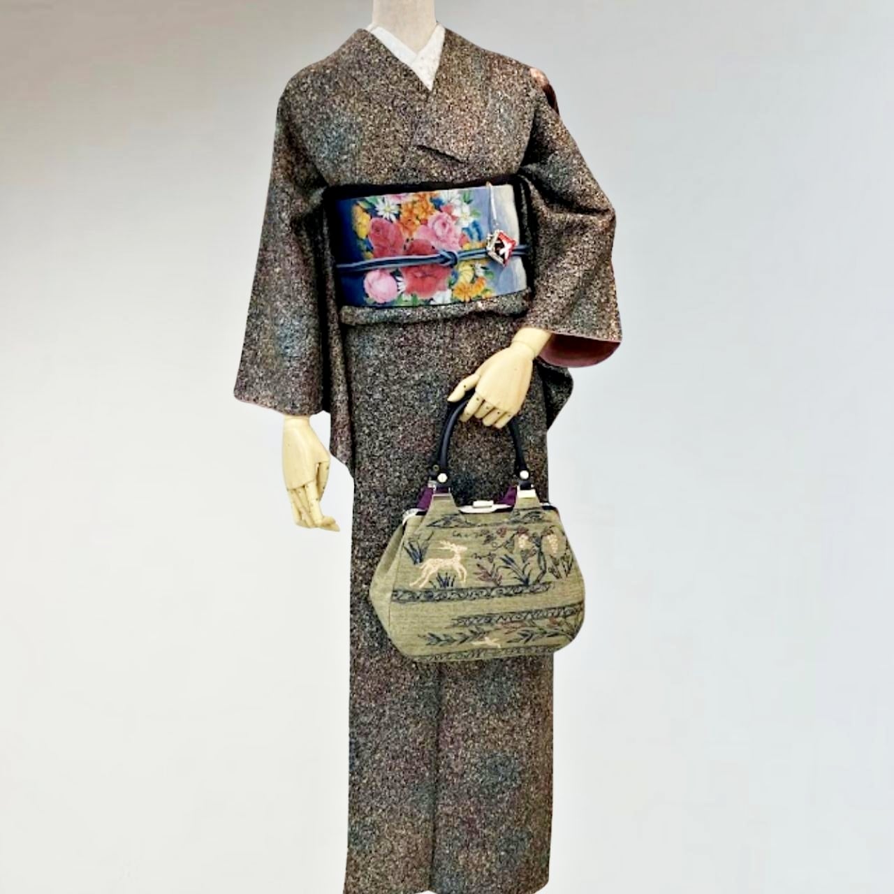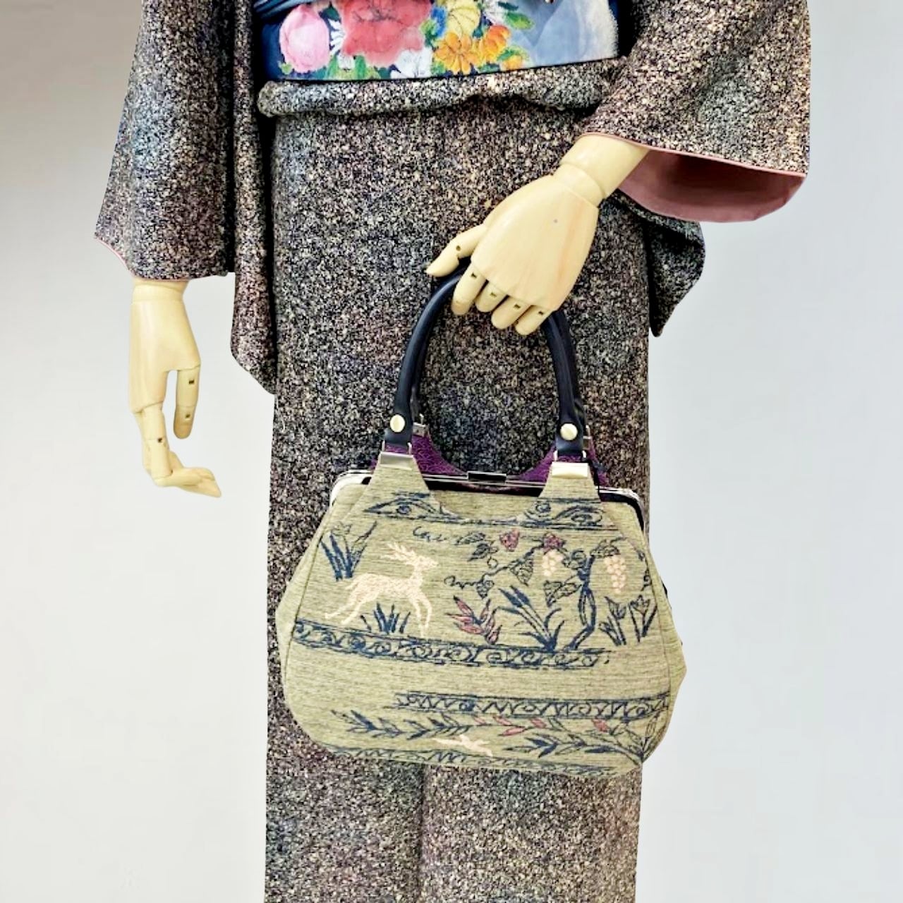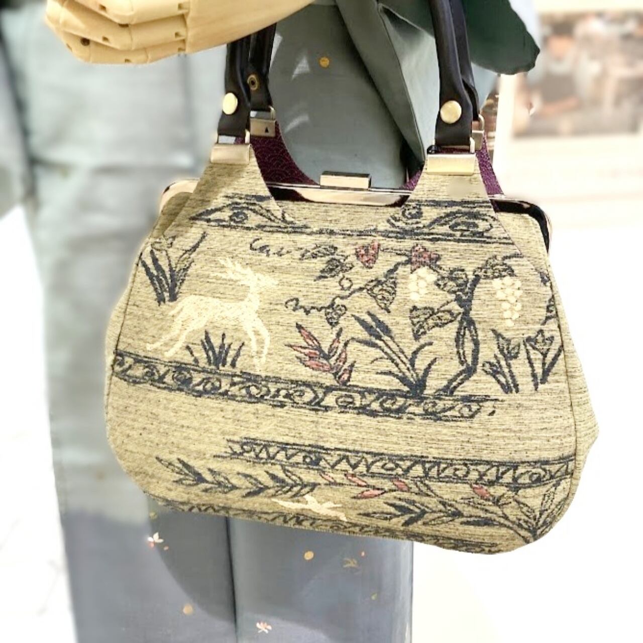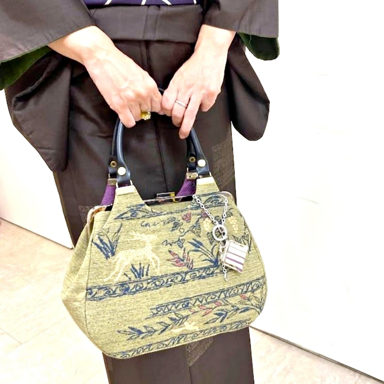 このバッグには、鹿文様が織り込まれた名古屋帯を使用しています。