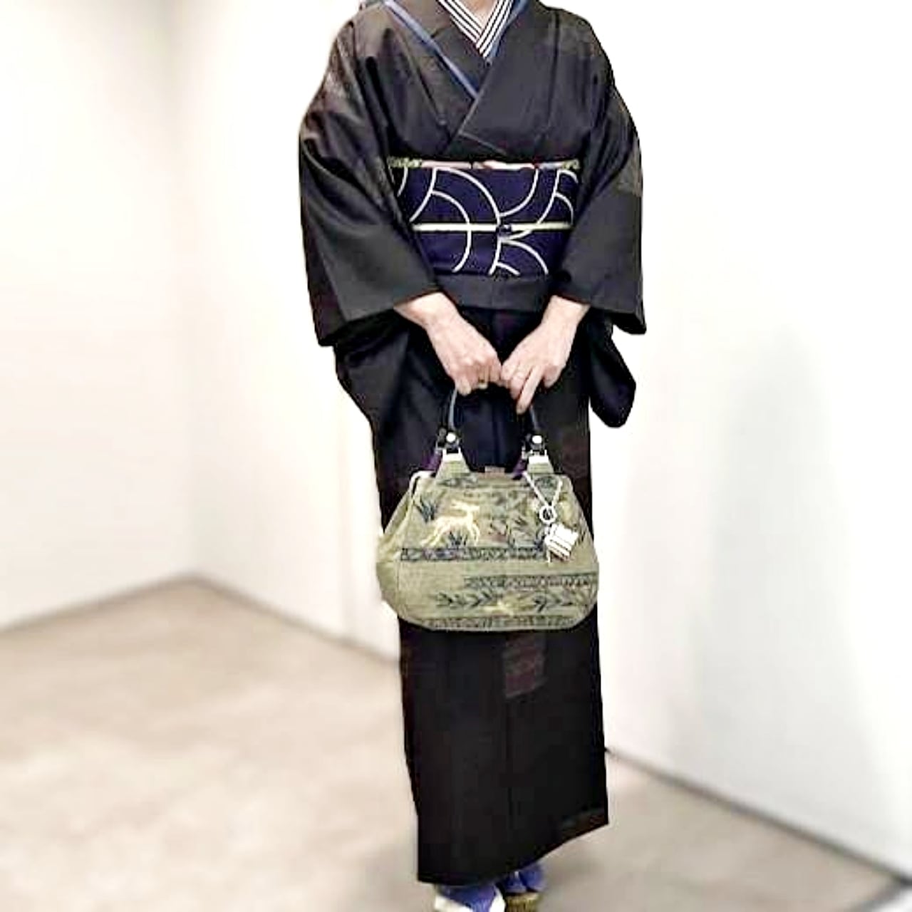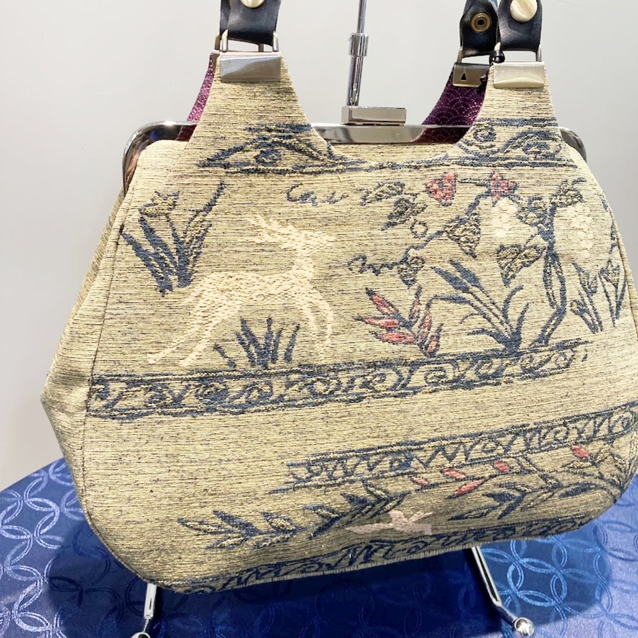 鹿文様 名古屋帯|あおりがまぐちバッグ|大容量・ポケット付き|着物リメイク