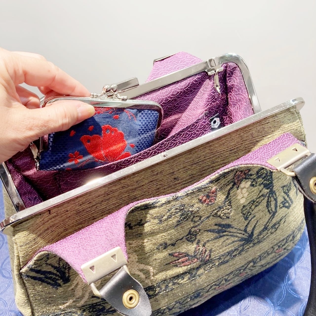着物地をリメイクした、あおりがまぐちバッグ(一点もの)です。
