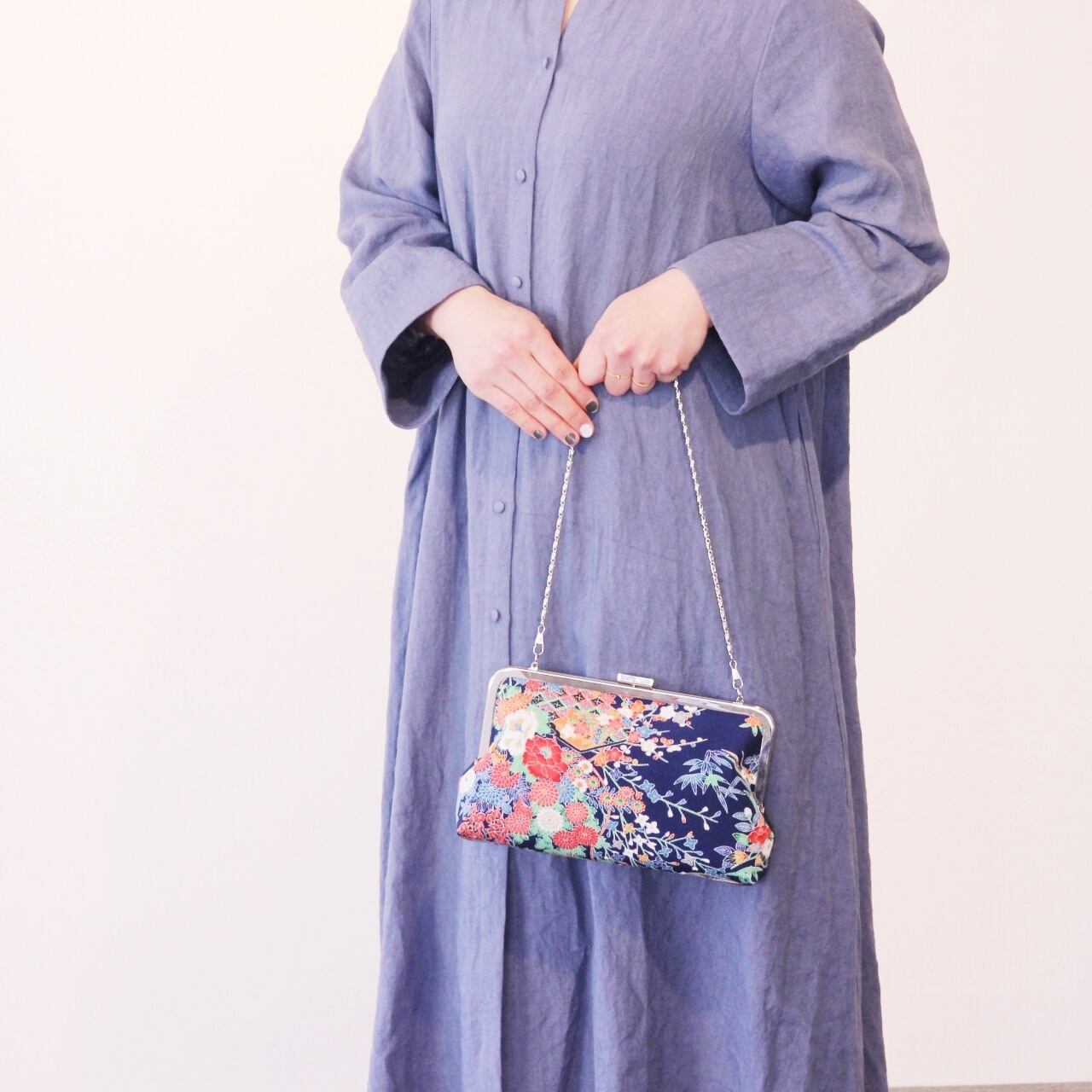 3way楽しめる がまぐちクラッチバッグ 着物リメイク 青小花柄