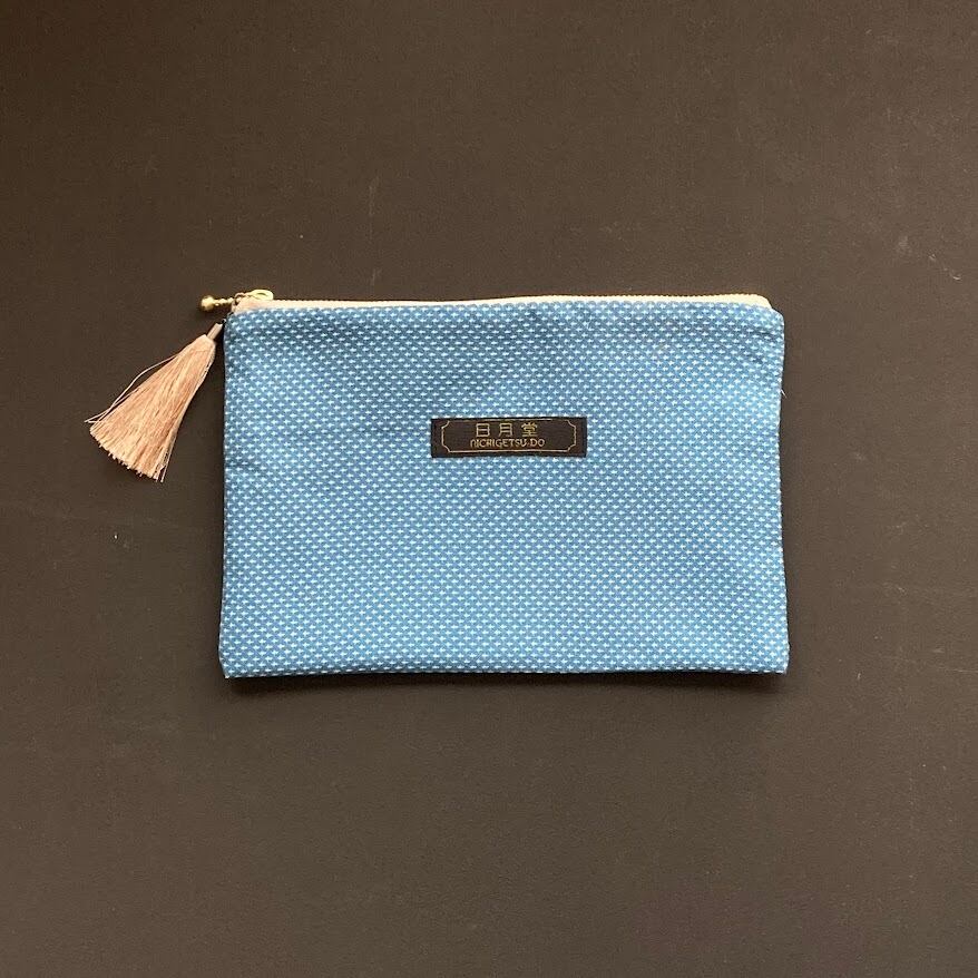 キモノぺたんこポーチ 紬・スカイブルー 着物リメイク 日月堂オリジナル