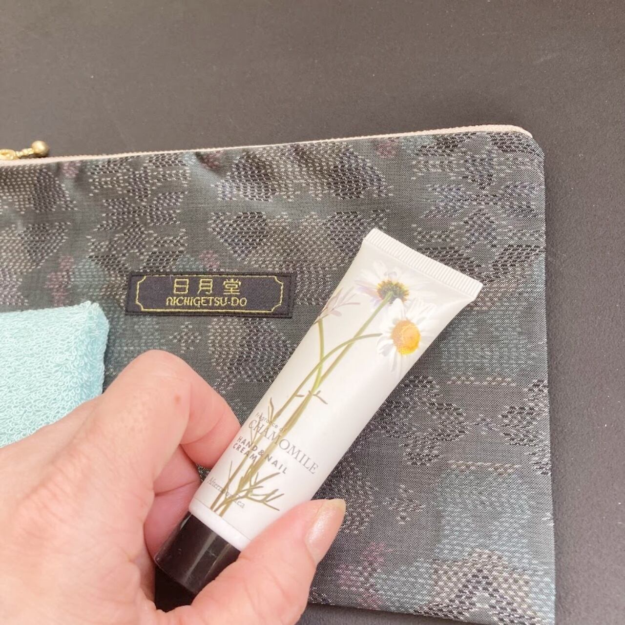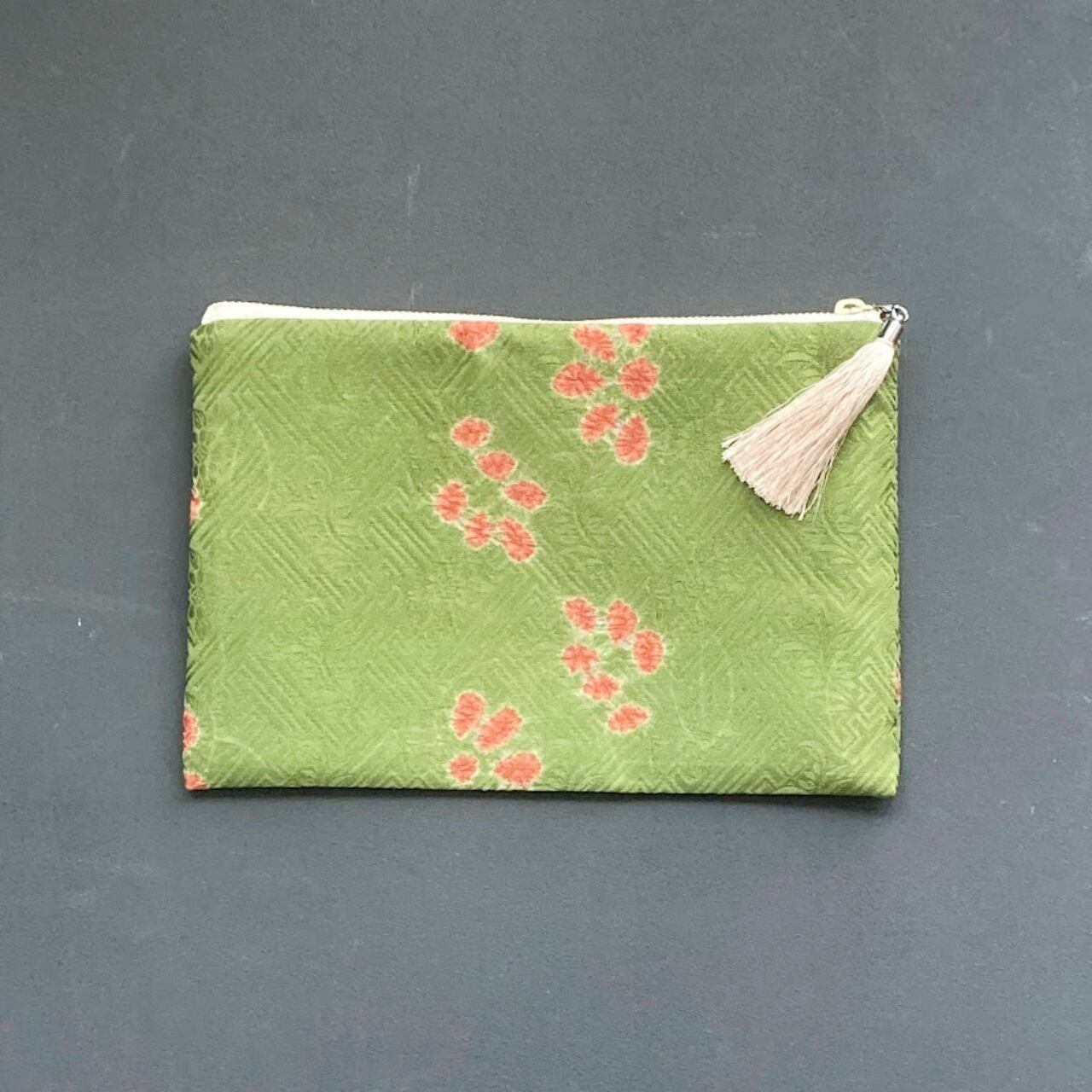 キモノぺたんこポーチ 地紋・みどり花 着物リメイク 日月堂オリジナル